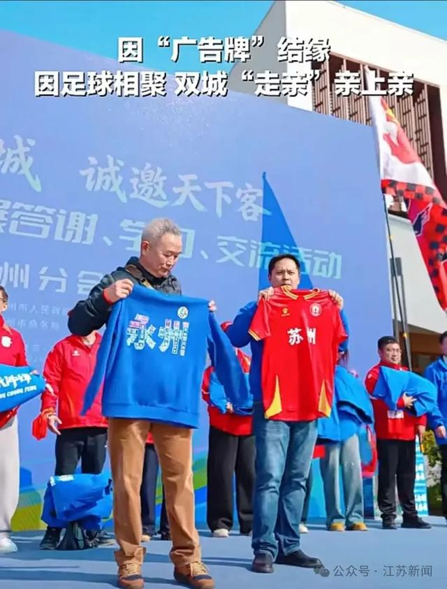 图片来源:吴江发布苏州也不甘示弱——早在永州夺冠时,就是首个为“十五弟”点亮祝贺灯牌的城市。这次在吴江盛家厍的球迷见面会上,两地球迷互换签名球衣与冠军帽,一句“欢迎来苏州过年”,道尽了江南的温婉与热情。除此之外,苏州本地企业代表还向永州嘉宾回赠了寓意“一缕红绸系深情”的红围巾与文创产品,苏州市民更是将现场的永州特产抢购一空。